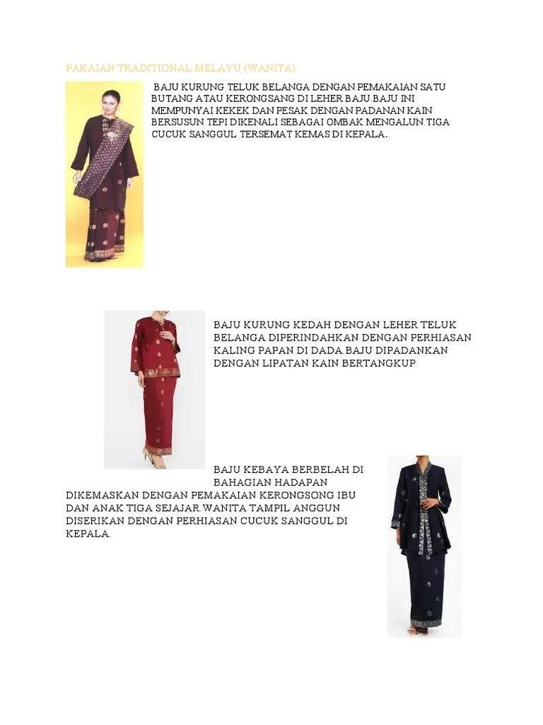 Kemudian wanita menggunakan kebaya laboh. Seni batik bukan sahaja digemari rakyat malaysia, bahkan pelancong juga meminatinya. Baju melayu terdiri daripada dua jenis iaitu baju melayu teluk belanga dan baju melayu cekak musang. Menurut sejarah kewujudan pakaian ini, baju kurung dikatakan wujud dua ratus tahun yang lampau. Dari daftar pakaian adat 34 provinsi di indonesia, salah satu yang menarik adalah baju tradisional dari riau.